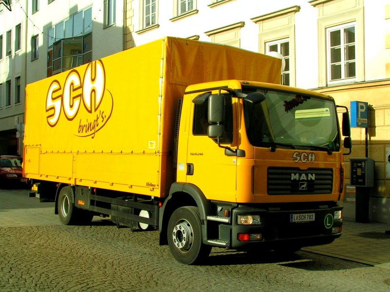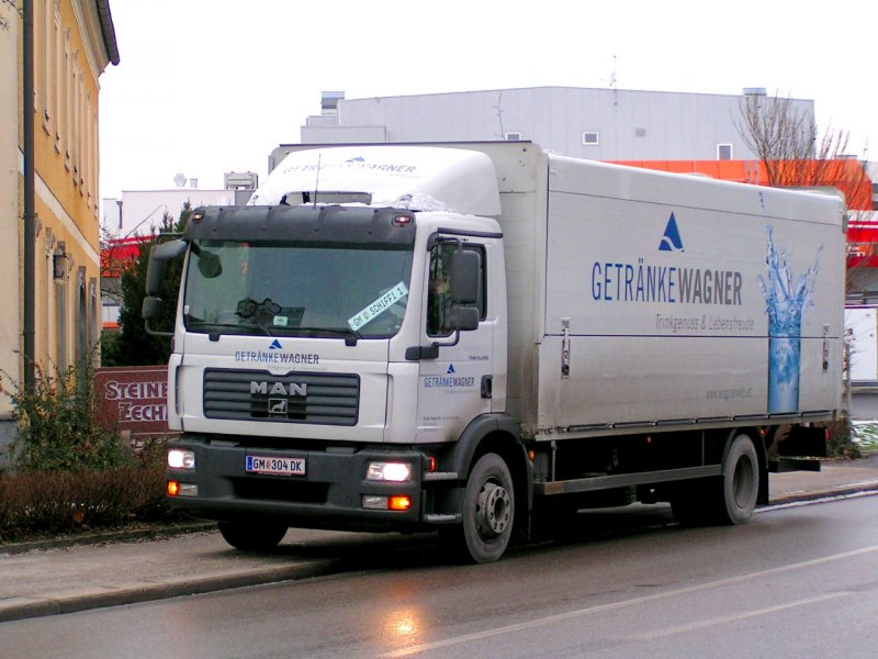 MAN-TGM15.280 einer Getränkehandelsfirma bei der Zustellung im Stadtgebiet von Ried i.I.; 080102