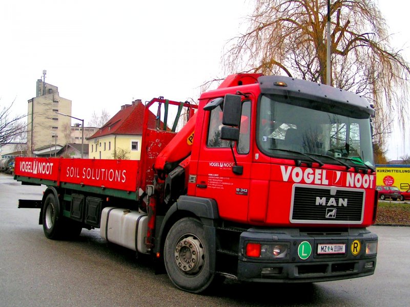 MAN(19.343-silent) der Fa.Vogel&Noot steht auf einem leicht abschüssigen Straßenstück, und der Fahrer sucht in der Landkarte den besten Weg nach Hause; Ried i.I.;080118