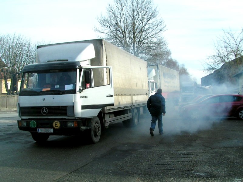 Mercedes 1324 schleppt einen weiteren 1324 am frostigen Morgen des 3.Jan.2008 an.
