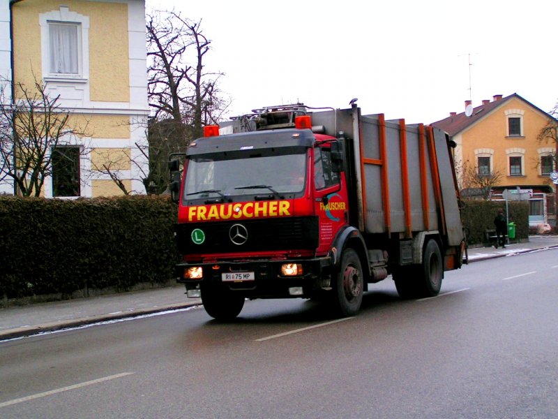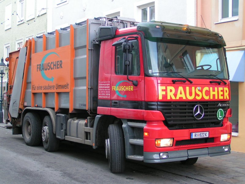 Mercedes eines Transport-Entsorgungsbetriebes mit Müllabfuhraufbau ist zum nächsten Einsatz unterwegs; Ried i.I.080102