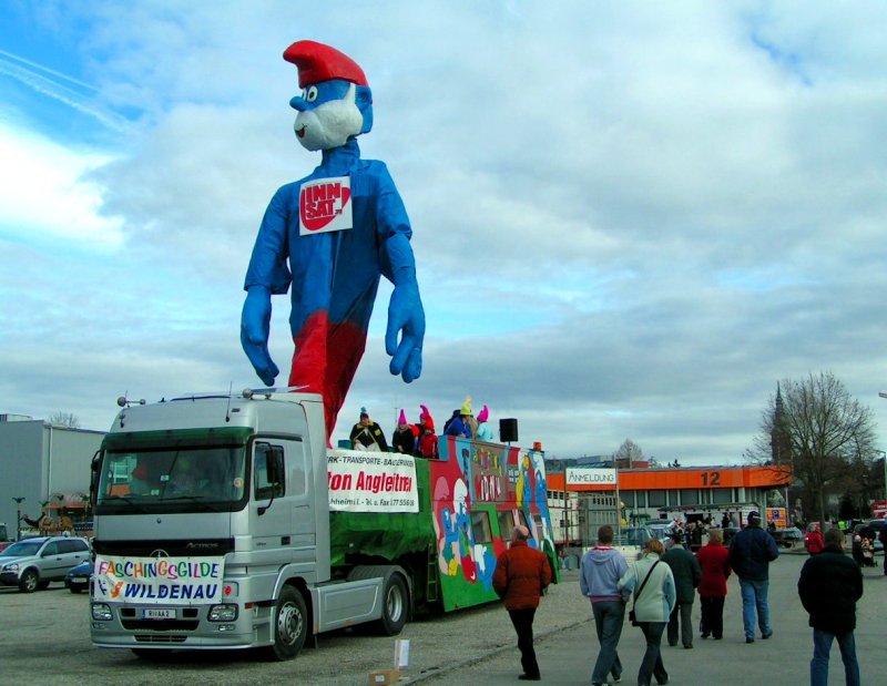 Mercedes-Actros1848, bahnt sich mit der "Papa-Schlumpf-Figur" seinen Weg durch die Menschenmassen beim Faschingsumzug; Ried i.I.080120