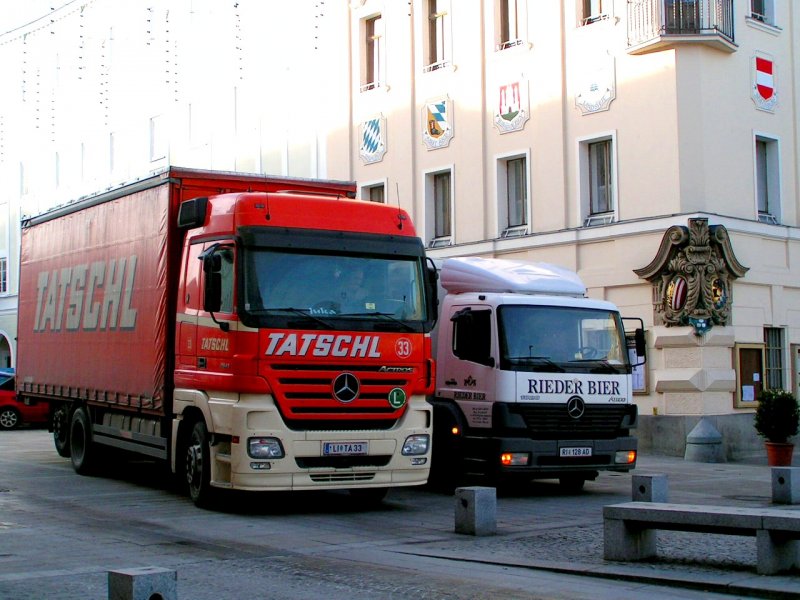 Mercedes ACTROS2641 sowie ATEGO1828 vor dem Rathaus Ried i.I.; 080103