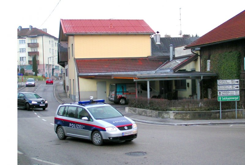 Rasant fährt dieser neue Polizeieinsatzstreifenwagen in den Kreuzungsbereich ; RIED i.I.080102