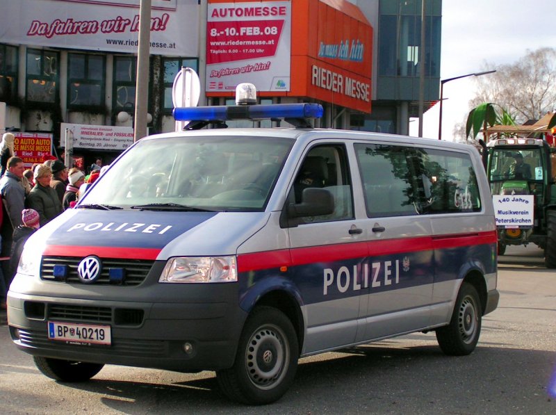 VW-Polizeibus (neue Ausführung) führt den Rieder Faschingsumzug2008 an; 080120
