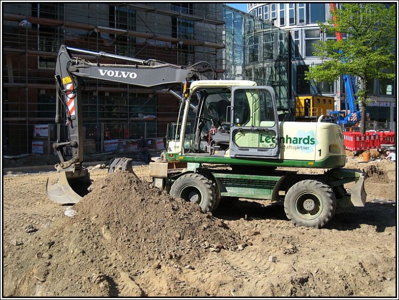 Dieser Volvo-Bagger wurde am 05.05.2008 von der Landschaftsgärtner-Firma Leonhards bei Baurbeiten in der Duisburger Innenstadt eingesetzt.