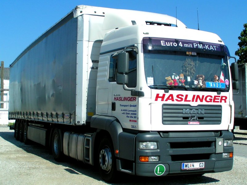 MAN-TGA18.430 mit "kunterbunten Armaturenbrett" wartet die Wochenendruhe am Messegelände RIED i.I. ab;080629