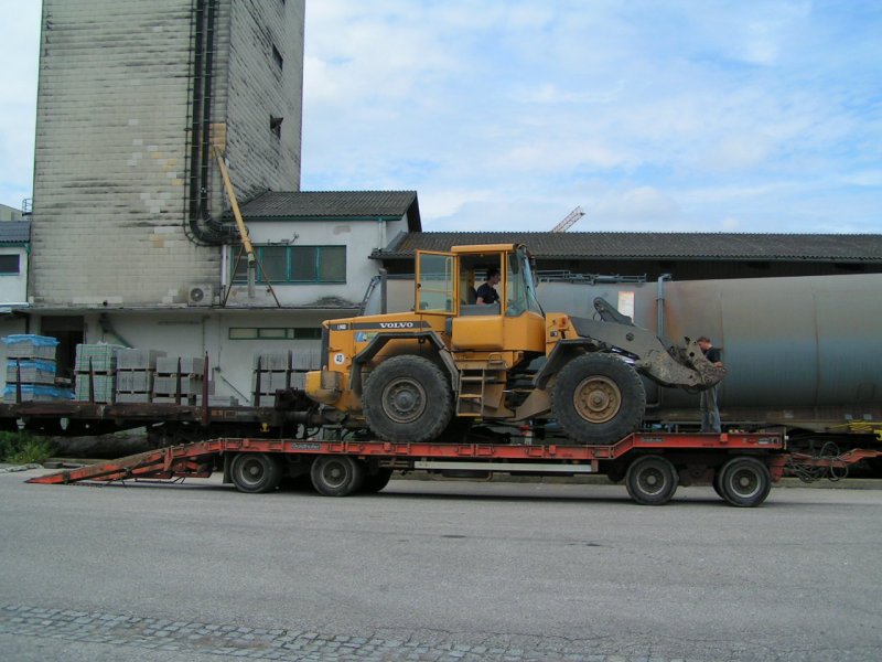 Radlader VOLVO "L90D" wird nach getaner Entladearbeit auf einen Tiefladeanhänger verladen; 080523