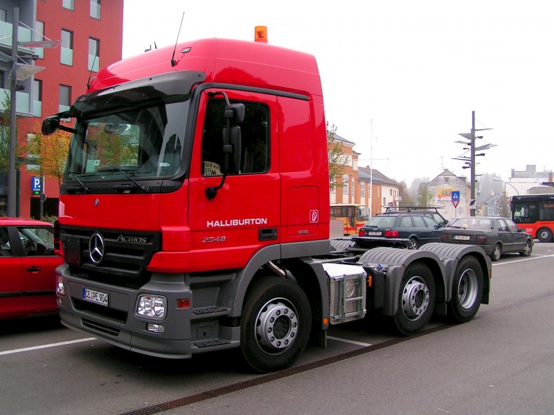 ACTROS-2548 Zugmaschine am Marktplatz in Ried i.I, mit einem handgeschriebenen Zettel hinter der Seitenscheibe, daß der Fahrer im angrenzenden (Nobel)Hotel übernachtet; 081010