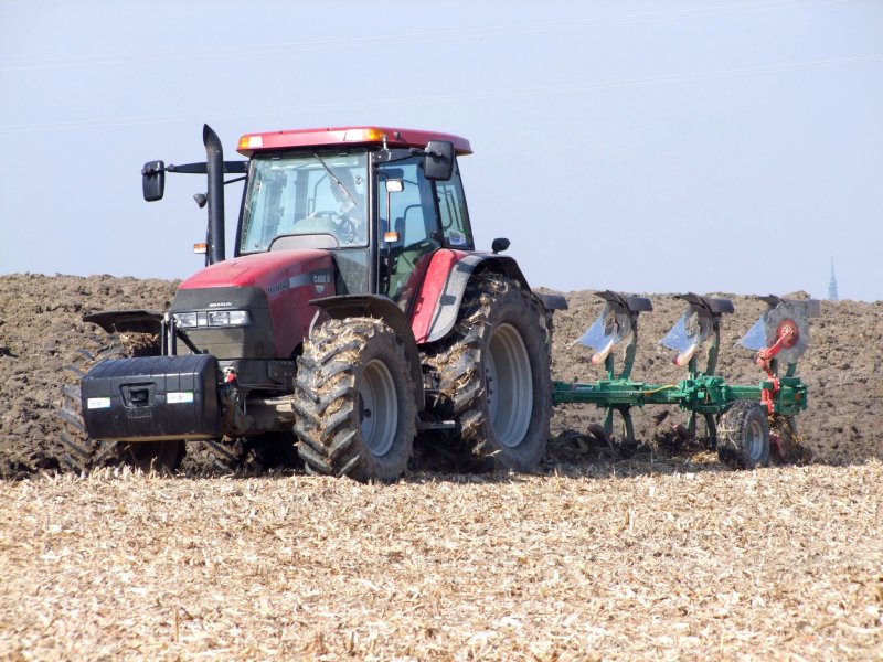 CASE-MXM140 mit 5Schar-Wendepflug, beim Umackeren eines abgeernteden Maisfeldes; 081008