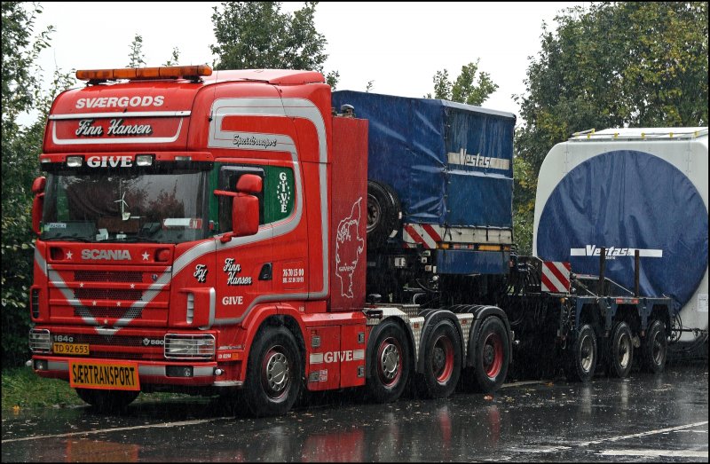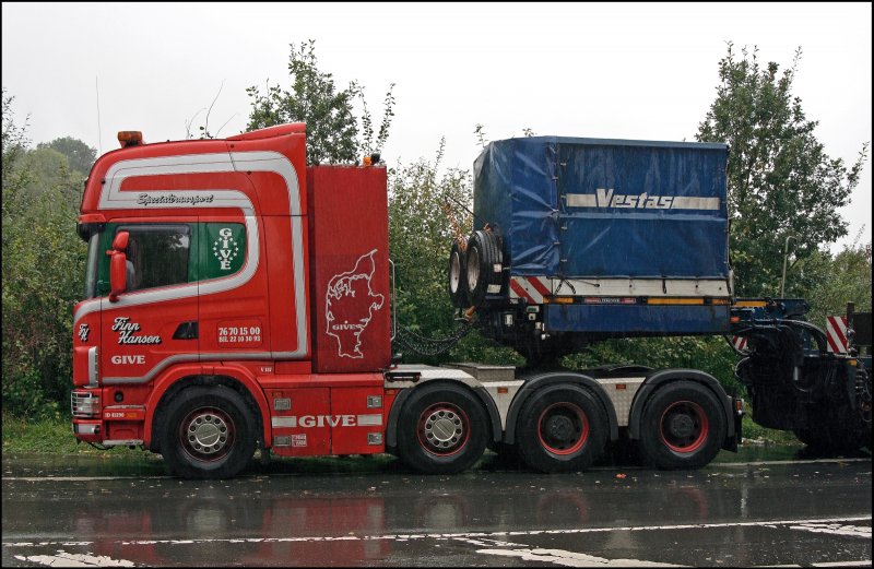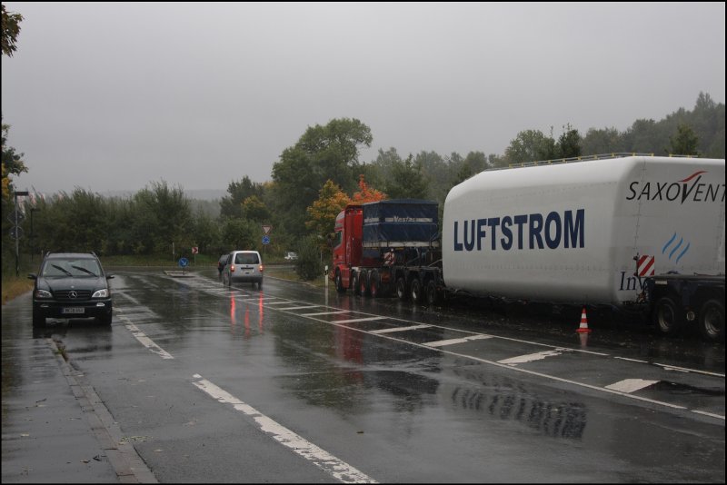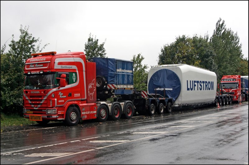 Zwei Schwertransporter, vermutlich beladen mit einem Windkraftmotor, stehen am Morgen des 01.10.2008 auf der Bundesstraße. Hier im Bild ein SCANIA 164G V8 580PS der Dänischen Transportfirma SVAERGODS.
