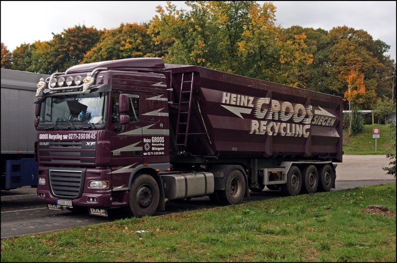 DAF XF105.410 von HEINZ GROOS RECYCLING aus Siegen. Das Unternehmen hat sich auf den Containerdienst, Schrotthandel und Recycling spezialisiert. Der Lkw besitzt neben der Zusatzbeleuchtung und den Michelinmänchen auch schönere Gardinen.(09.10.2008)