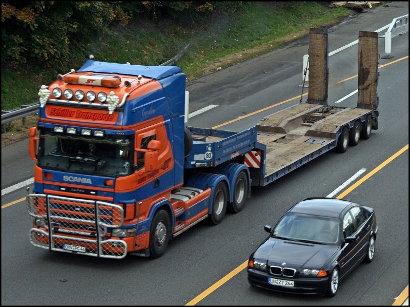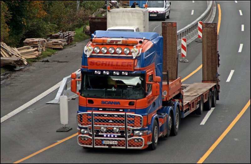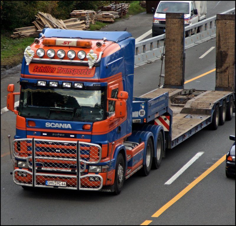Ein Genuss für die Ohren war dieser Scania 164L 480 \8/ der SCHILLER TRANSPORTE als er nach der Baustelle ordentlich beschleunigte. Ausgestattet mit Bullenfänger, Zusatzscheinwerfer und Michelinmänchen ist der Lkw bei Lüdenscheid-Süd am 09.10.2008 in Richtung Siegen unterwegs.