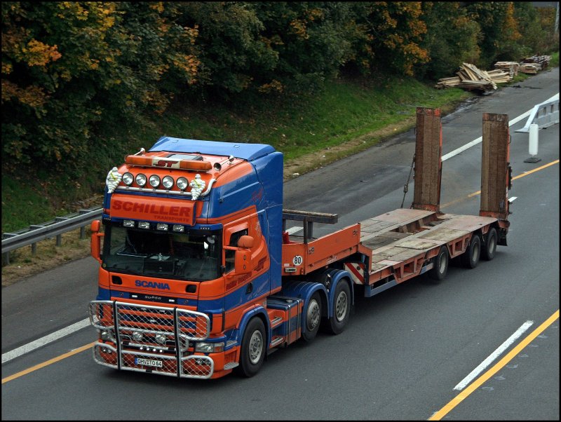 Ein SCANIA der Spedition SCHUMACHER ist mit einem Kühlauflieger in Richtung Süden unterwegs. (09.10.2008)