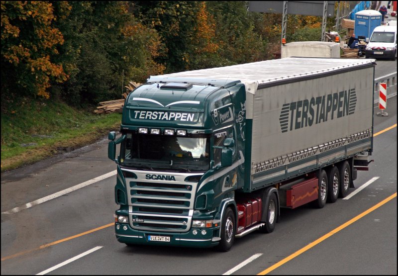 Ein schöner \8/ ist das! Dieser Scania R580 \8/ ist mit einem sehr schönen Auspuffsound in Richtung Süden unterwegs. Deutlich ist die Sidepipe mit den Drei Ausgängen zusehen. (09.10.2008)