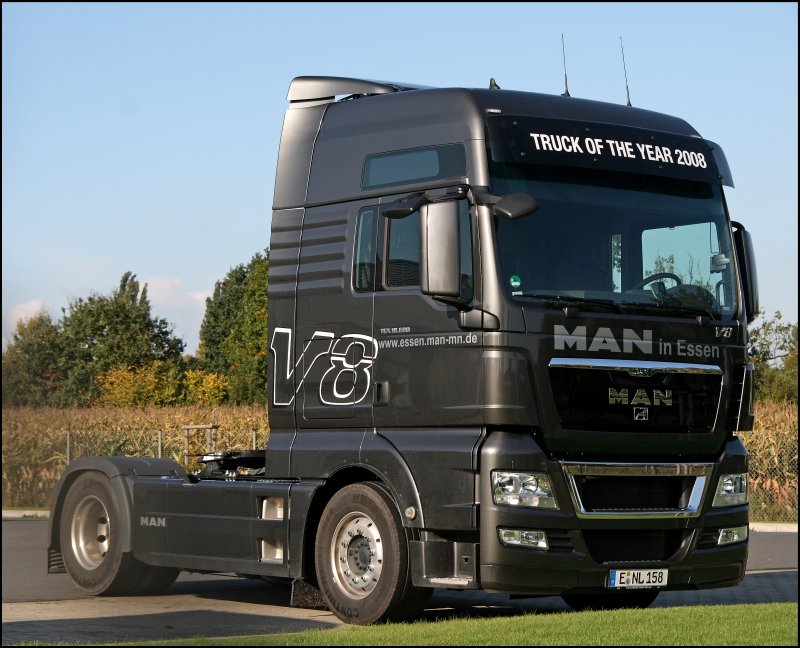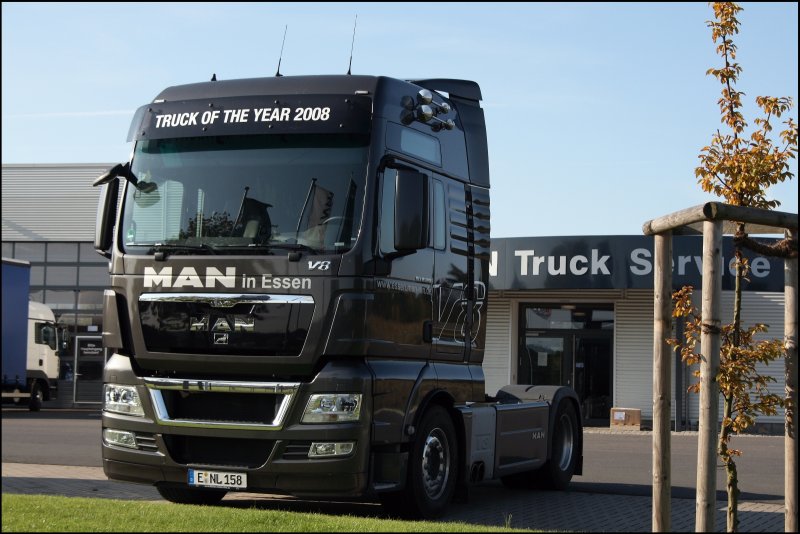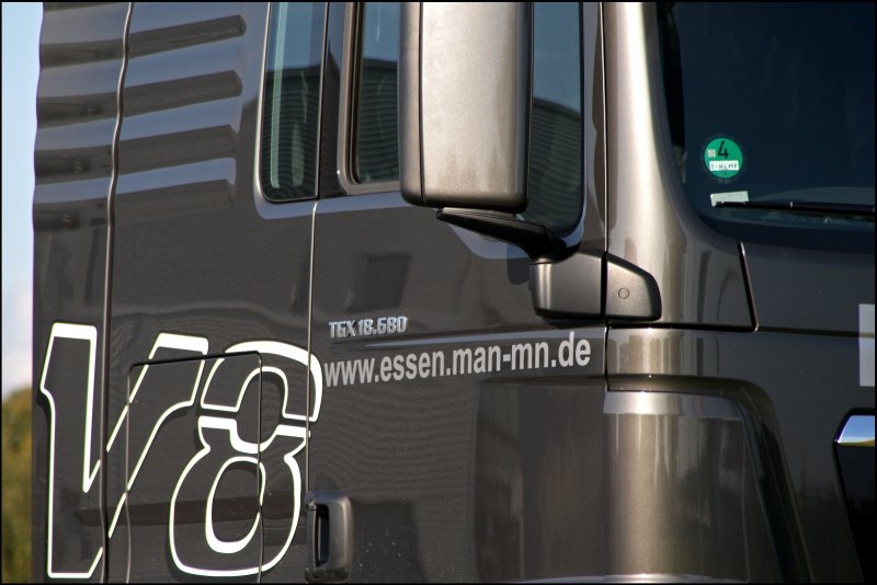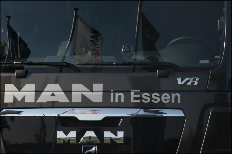 So wie er da steht, so möchte ich ihn haben*gg*: Bei MAN in Hagen konnte ich am Tag der Deutschen Einheit das Flagschiff von MAN ablichten! Im edelen Silbergrau sonnt sich der MAN TGX 18.680 in der Morgensonne. Diese Kraftmaschine wird durch ein 16,2 Liter Hubraum, 8 Zylinder CommonRail Triebwerk mit Doppeltrubo angetrieben und stemmt bei 1400 Touren 3000Nm Drehmoment auf die Kurbelwelle! Die elegante Form dieser Kraftmaschine brachte ihm den Preis "TRUCK OF THE YEAR 2008" ein. Okay zugegeben, wer braucht so eine "normale" Sattelzugmaschine die warscheinlich mehr als 500.000.- kostet?
