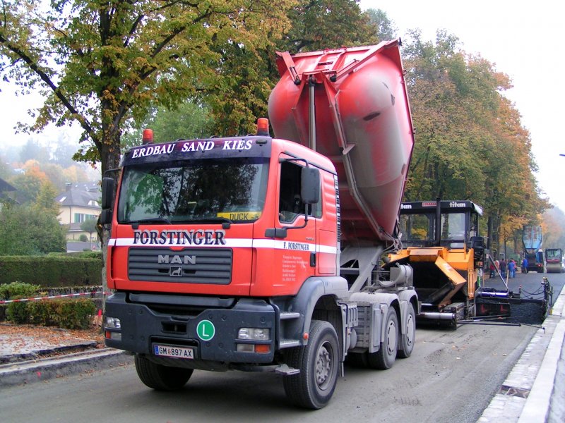 MAN(TG460A) beschickt einen Asphaltfertiger bei einer Straßenbaustelle in Ried i.I.; 081010