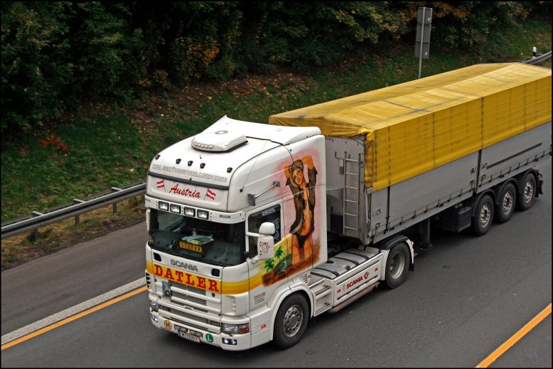 Ein weiteres Highlight am nicht sehr sonnigen 09.10.2008 war der SCANIA 164L 580 V8 der DATLER Int. Schüttguttransporte. Neben dem Scania besitzt die Firma auch noch einen DAF XF105.510 und einen DAF XF95.530. Alle besitzen Zusatzscheinwerfer und "Kunstwerke" an den Kabinen.
