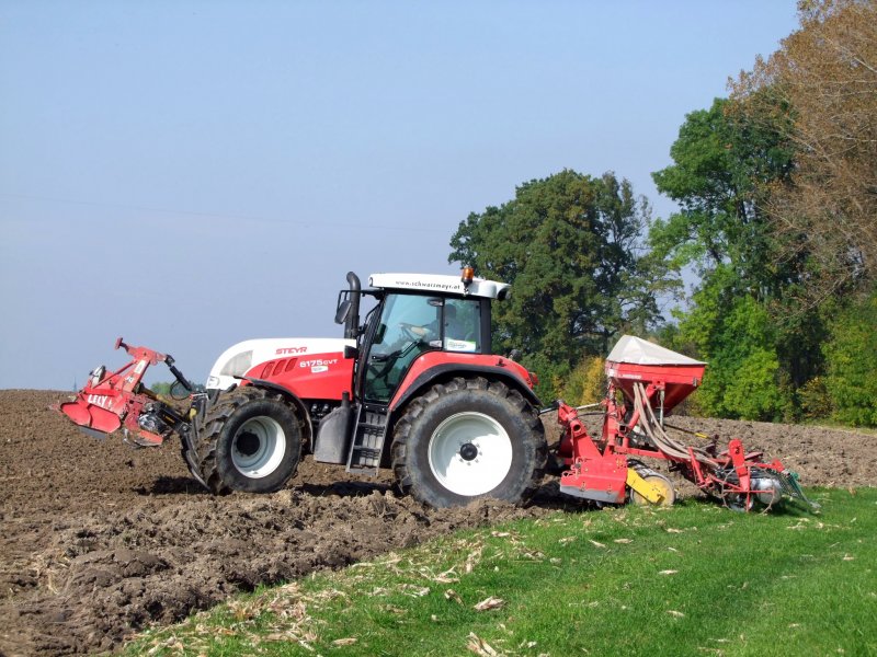 STEYR 6175CVT bringt eine Leistung von 175PS, und ist hier bei der Winterweizensaat zugange; 081009