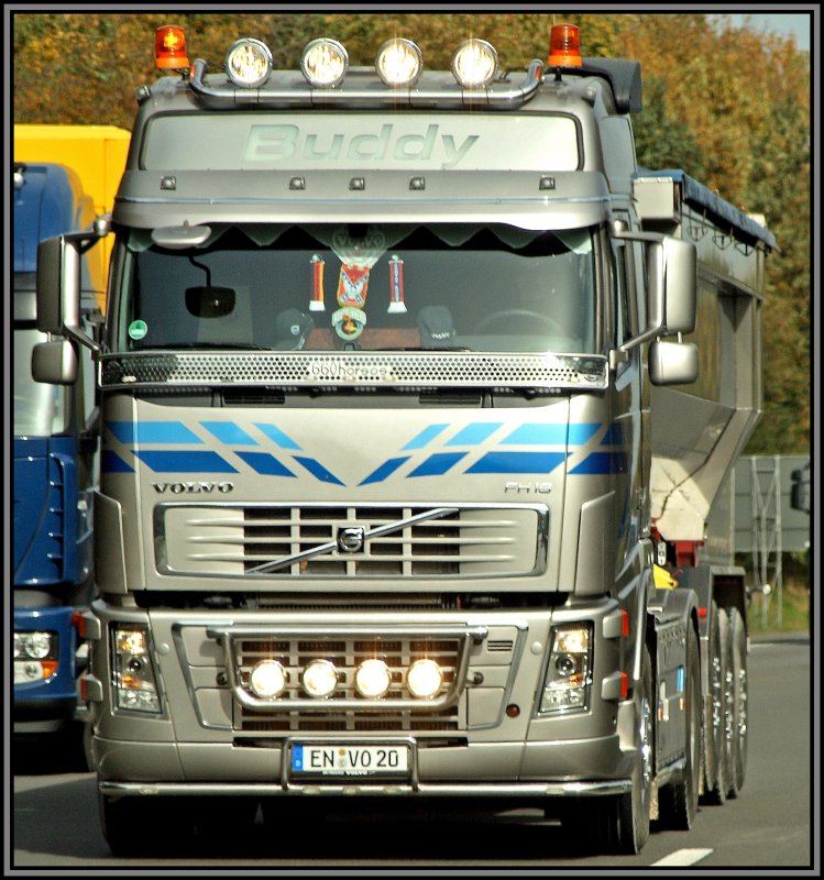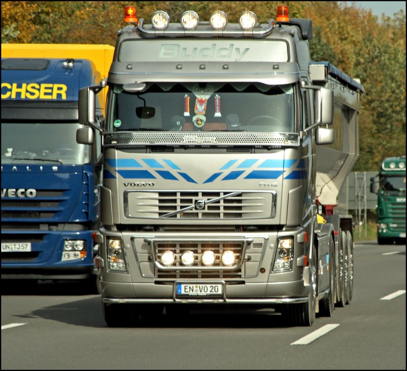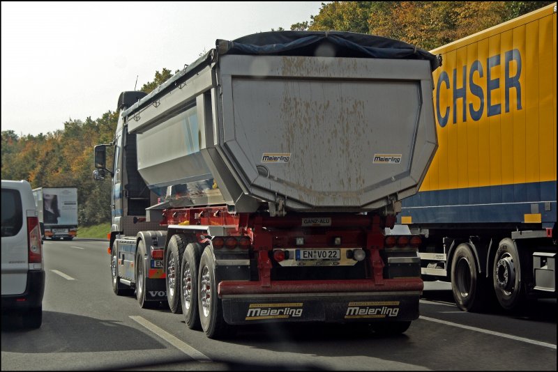 Alufelgen, vermutlich sogar Chromfelgen, Sidepipe sind ehr selten an Baustellenfahrzeugen angebracht. Dieses Transportunternehmen besitzt aber sehr viele Volvo´s mit solchen "Extras". Zugmaschine ist ein Volvo FH16 mit 660 Pferdestärken... (13.10.2008)