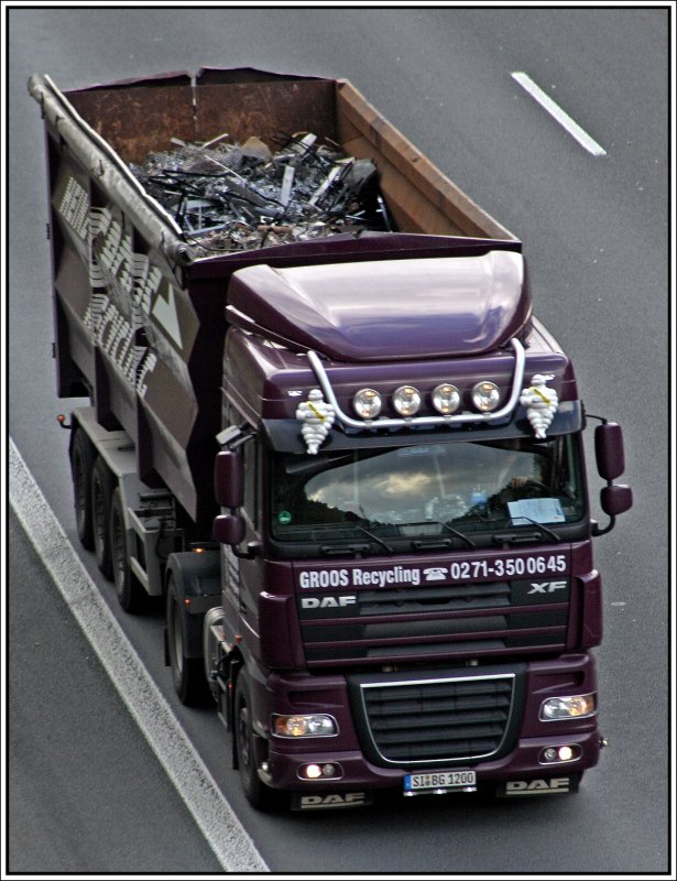 DAF XF105.410 von HEINZ GROOS RECYCLING hat Stahlschrott dabei und ist nach Siegen unterwegs. (17.10.2008)