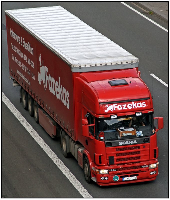 Ein SCANIA 124L 420 der Ungarischen Spedition Fazekas ist bei Lüdenscheid unterwegs.