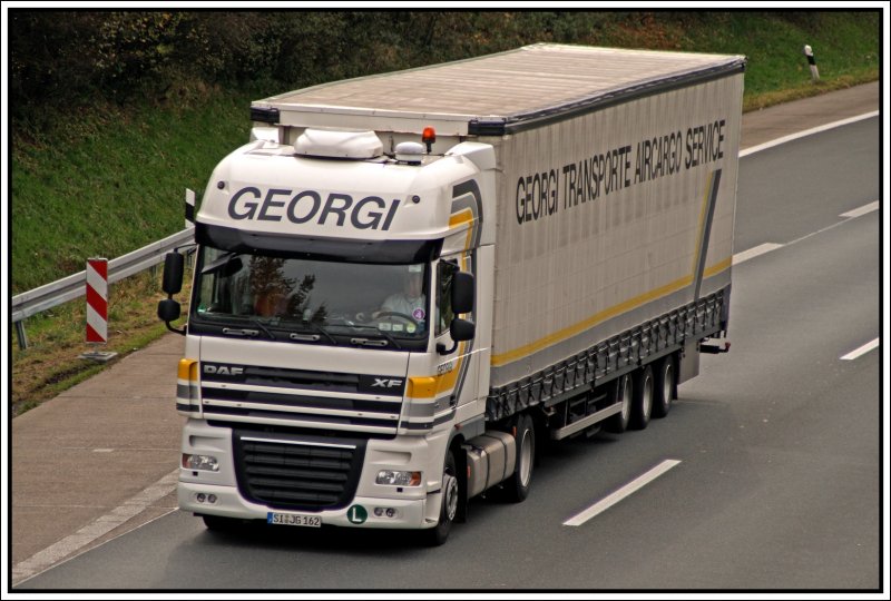Gleich Drei Lkw´s von GEORGI konnte ich am 22.10.2008 bei Lüdenscheid ablichten. GEORGI ist Deutschlands größter Anbieter im internationalen Flughafenersatzverkehr. Start- und Zielpunkt ist immer der Flughafen Frankfurt/Main. GEORGI transportiert die Luftfracht zwischen den Luftdrehkreuzen Europas oder von dort zum Bestimmungsort. Selbst Tunesien ist einer der Zielpunkte!!! DAF XF105.410SSC "SuperSpaceCab" von GEORGI TRANSPORTE AIRCARGO SERVICE aus Burbach führt die Truppe an.