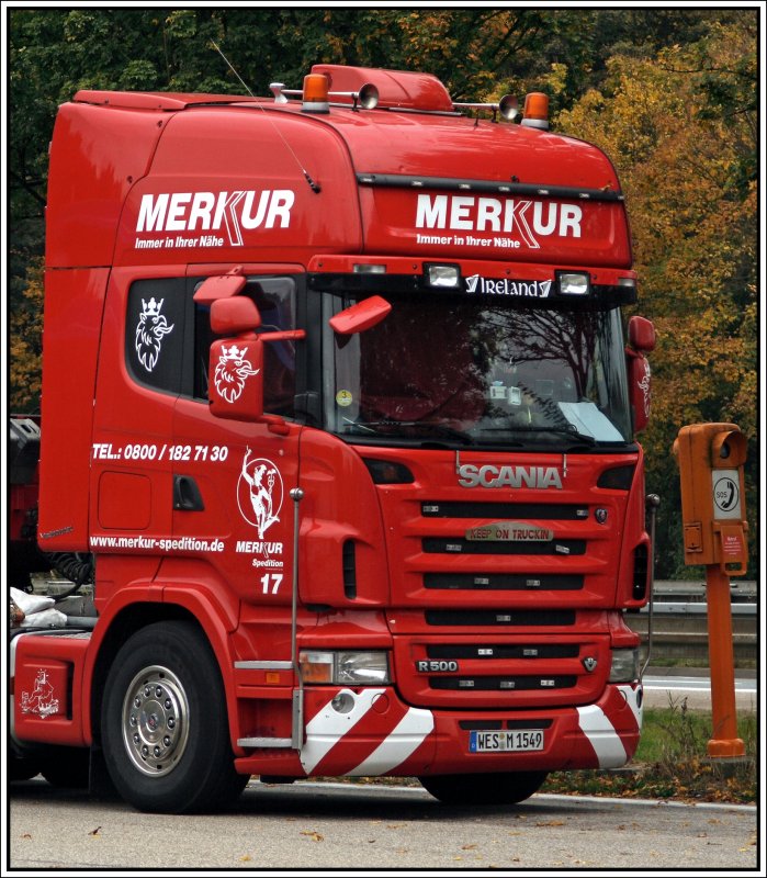 SCANIA R500 \8/ des Schwertransportunternehmen MERKUR aus Sonsbeck/Niederrhein bei Xanten. Aufgenommen am Mittag des 15.10.2008.