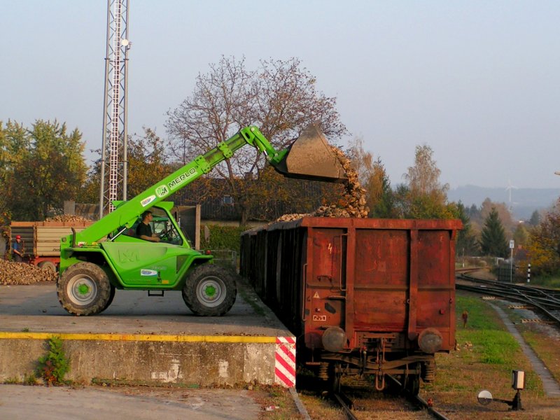MERLO belädt mit einer Ladeschaufel Eaos Wagen mit Zuckerrüben am Bhf. RIED i.I.; 081015