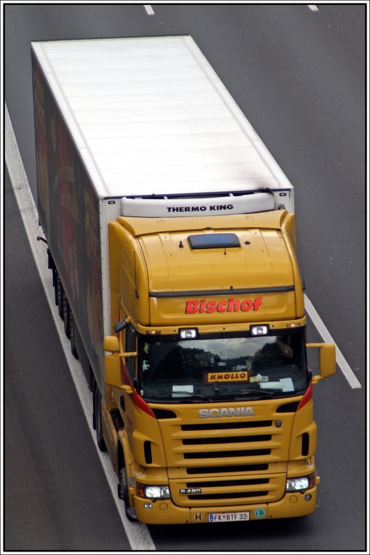 SCANIA Topline R420 der Spedition Bischof ist mit einem Kühlauflieger in Richtung Süden unterwegs.