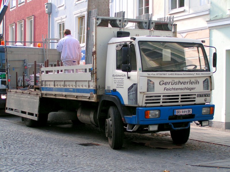 STEYR 16S18 bei der Anlieferung von Gerüstteilen am Kirchenplatz in Ried i.I.; 081010