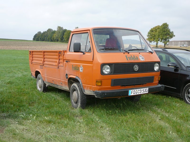 VW T 3 mit Ladepritsche, mit Werbung für die Stadt Fulda, beim Leistungspflügen in 36100 Petersberg - Böckels am 13.09.2008. Veranstalter war neben dem Landkreis Fulda der Kreisbauernverband Fulda-Hünfeld e. V. und der Landesbetrieb Landwirtschaft Hessen