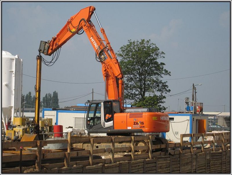 Düsseldorf, U-Bahn-Projekt Wehrhahnlinie, künftiger Haltepunkt Graf-Adolf-Platz, 30.05.2008: Ein ABI-Rammgerät mit einem Sennebogen-Bagger als Trägerfahrzeug.