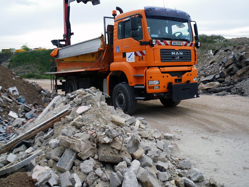 MAN TGA 18.310 mit Palfinger PKG 12001 kurz nach dem Abladevorgang von Bauschutt.