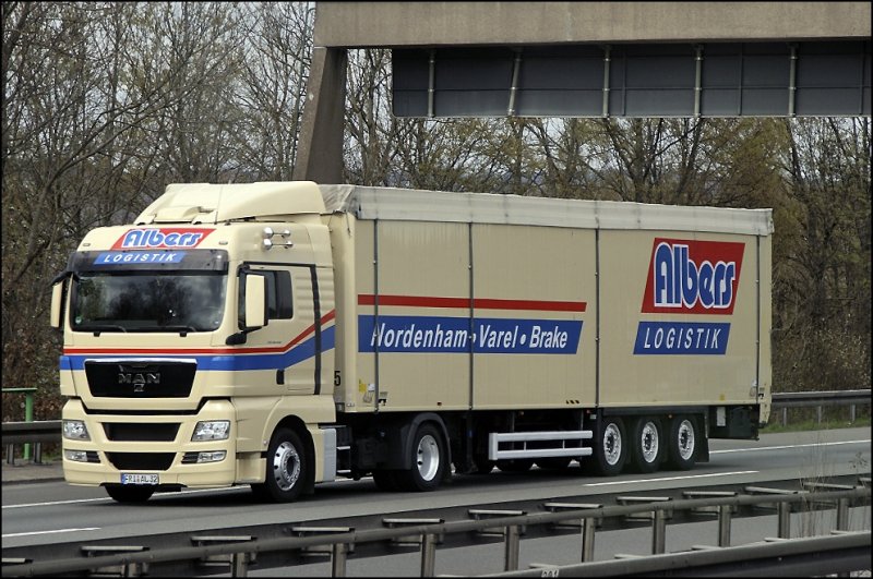 MAN TGX 18.440XLX von ALBERS Logistik ist bei Hagen-Süd in Richtung Süden unterwegs. Albers beschäftigt an 3 Standorten in Deutschland ca. 165 Mitarbeiter. Der Fuhrpark besteht aus 180 Fahrzeugeinheiten. Am Hauptsitz betreibt Albers spezielle Anlagen für die Lagerung, Verladung und den Umschlag von Bulkware. ALBERS ist Partner der chemischen Industrie und der Papierindustrie.