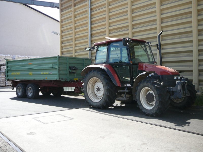 NewHolland L 95 steht mit Doppelachsanhänger vor der Getreideablieferung bei der Raiffeisenwarenzentrale in 36088 Hünfeld am 07.08.09