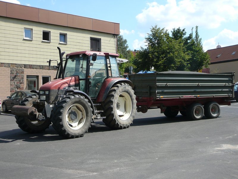 NewHolland TS 110 steht mit Auwärter-Doppelachsanhänger vor der Getreideablieferung bei der Raiffeisenwarenzentrale in 36088 Hünfeld am 07.08.09