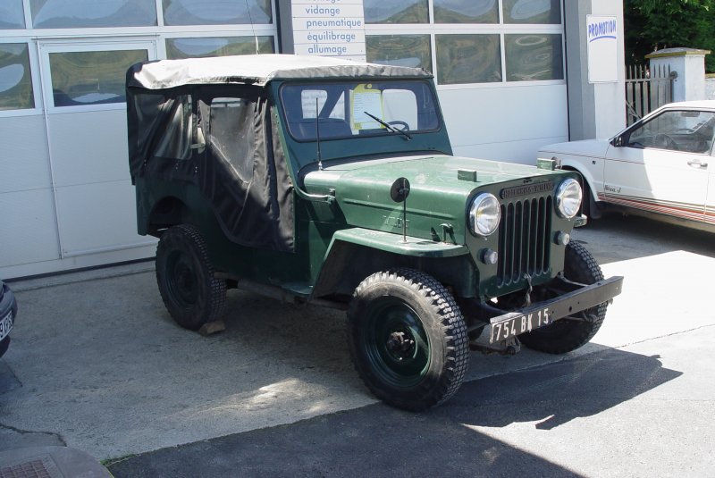 Am 26.07.2009 in der Auvergne in Frankreich. Eine eher unscheinbare Garage und Tankstelle, aber eine Menge Oldtimer zum Verkauf: u.a. dieser Hotchkiss Willy's Jeep JH 101 von 1956