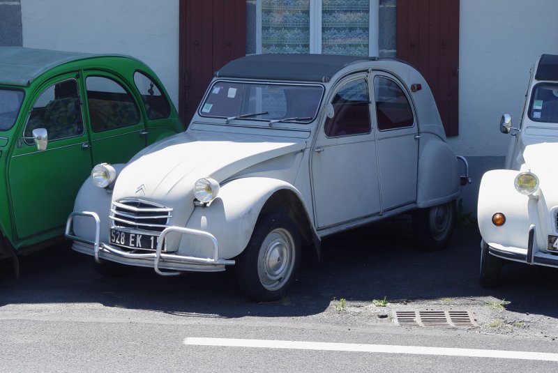 Am 26.07.2009 in der Auvergne. on den 5 2 CV hier der wohl älteste, mit anderem Kühlergrill und dem Logo auf der Motorhaube. Auc die Vordertüren sind anders angeschlagen als bei den neueren Modellen. Auch das hintere Seitenfenster fehlt noch und die Rückspiegel sind ebenfalls an anderer Stell angebracht. Die Blinker sitzen da, wo die neueren Modelle das 3. Seitenfenster haben.