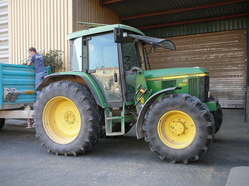 John Deere 6310 nach der Anhängerentladung bei der Raiffeisenwarenzentrale in 36088 Hünfeld, August 2009