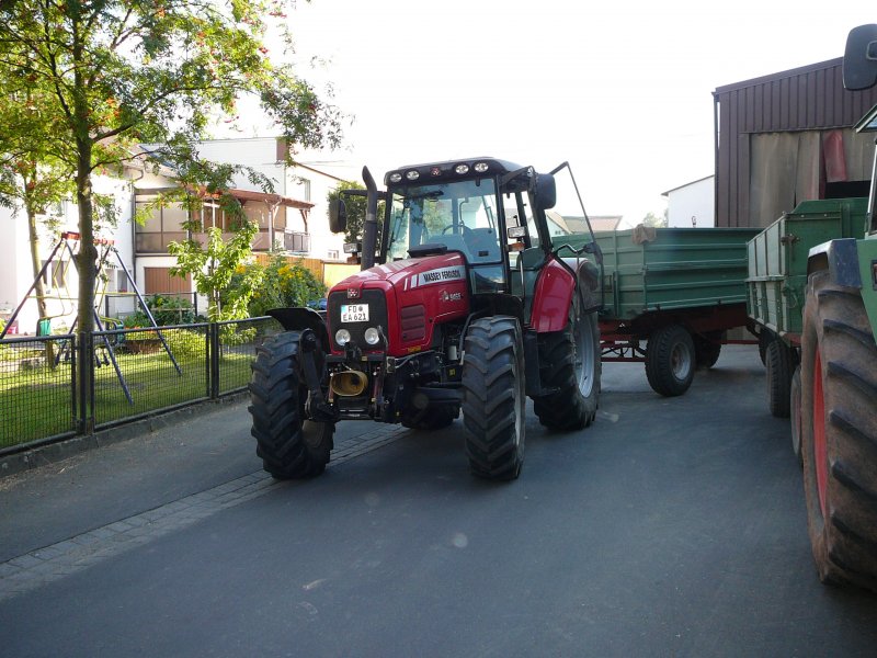 MF 5465 steht mit Anhänger auf den Betriebshof der Raiffeisenwarenzentrale in 36088 Hünfeld, August 2009
