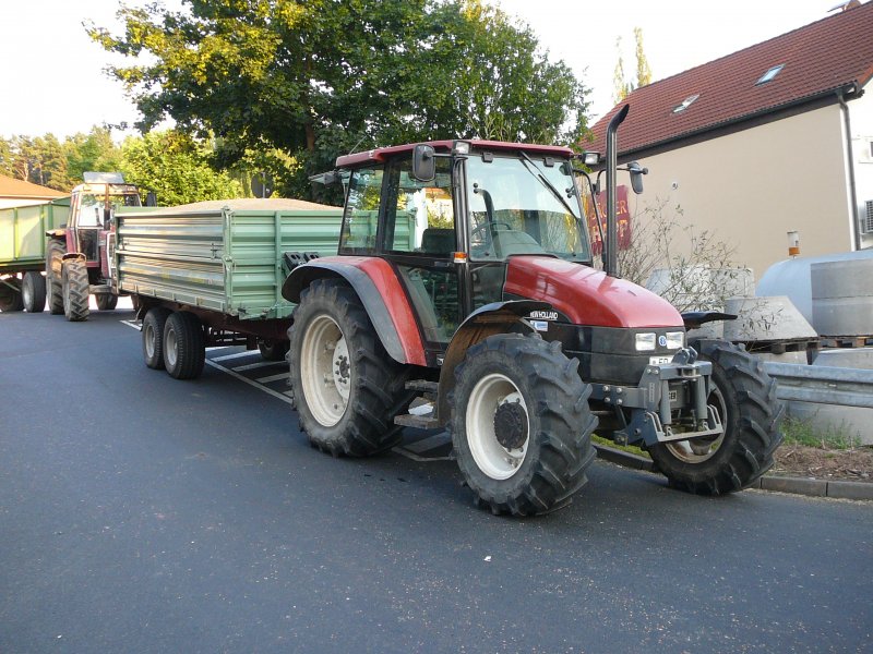 NewHolland Fiatagri L95 steht mit beladenem Anhänger vor der Getreideanlieferung der Raiffeisenwarenzentrale in 36088 Hünfeld, August 2009