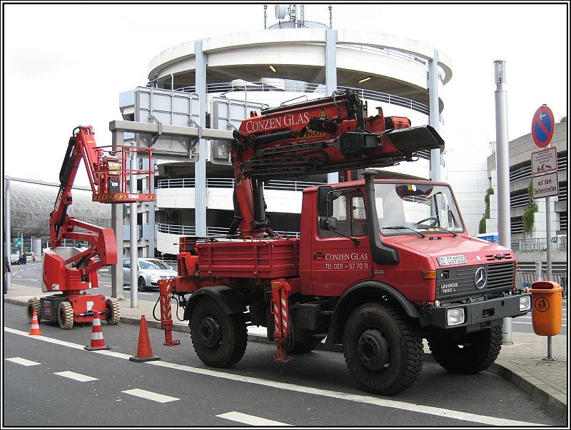 Unimog mit Arbeitsgerät (Kran?) und Arbeitsbühne eines unbekannten Herstellers, aufgenommen am 07.05.2009 beim Düsseldorfer Flughafen.