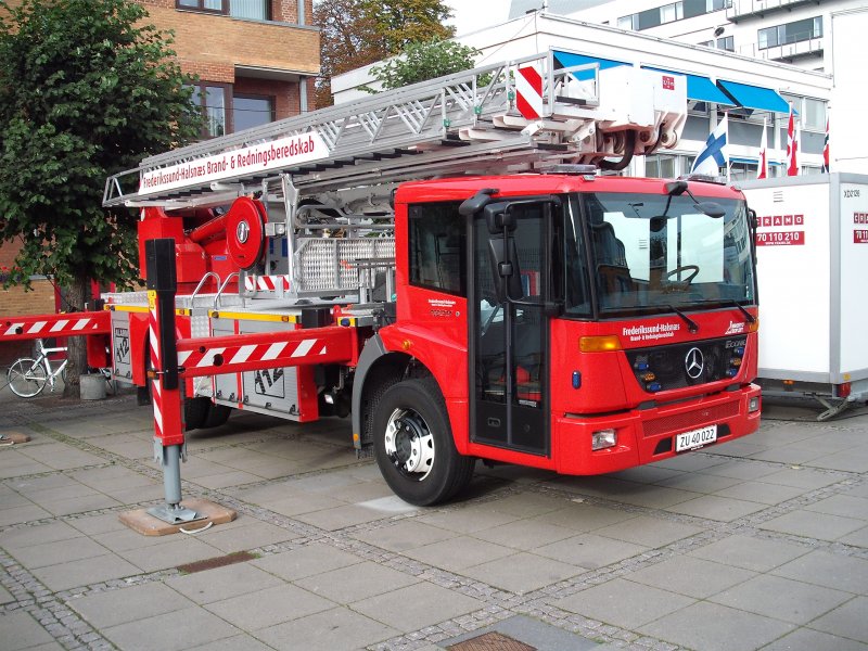 Eine Drehleiter der Feuerwehr in Frederiksund (DK). Der Fahrzeugtyp ist natürlich ein MERCEDES.