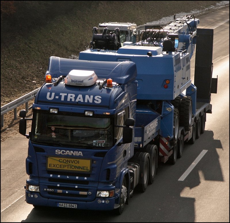 Öffters auf der A45 anzutreffen sind die Lkws der Spedition U-Trans. Transportiert werden TEREX Bagger und für solche schweren Geräte müssen auch starke Zugmaschinen her. SCANIA R580 8/ sind meistens im Einsatz. (28.01.2009)