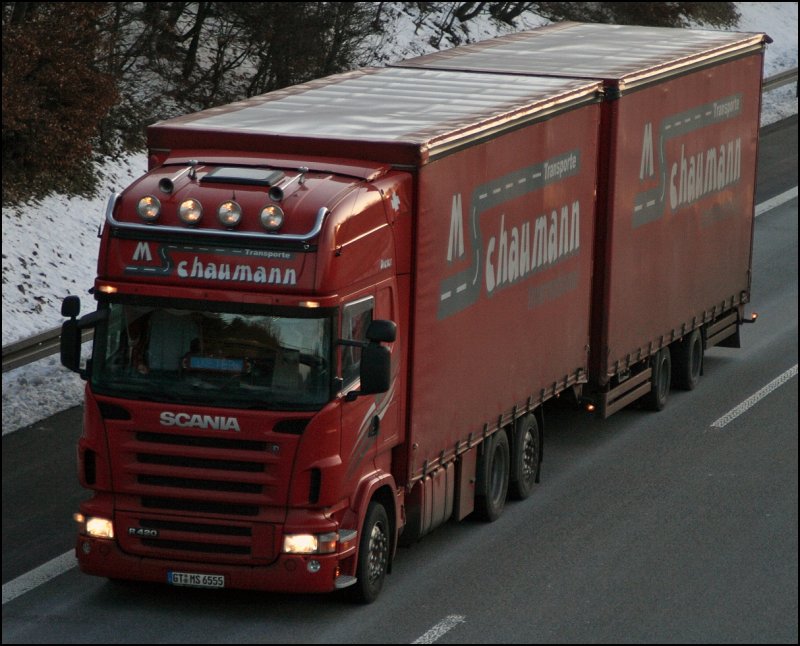 SCANIA R420 der M.SCHAUMANN TRANSPORTE ist in Richtung Heimat unterwegs. M.Schaumann Transporte GmbH & Co.KG. hat sich auf dem Transport in die Schweiz spezialistiert. Eingesetzt werden größtenteils MEGA und JUMBO Auflieger. Transportiert wird Sammelgut etc. (29.01.2009)