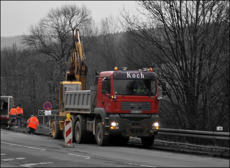 Unweit von Daheim wird an der Landstraße ein langer Graben ausgehoben... MAN TGA 26.430 D20 CommonRail von Carsten Koch Baustoffe&Transporte aus Schalksmühle. (16.03.2009)