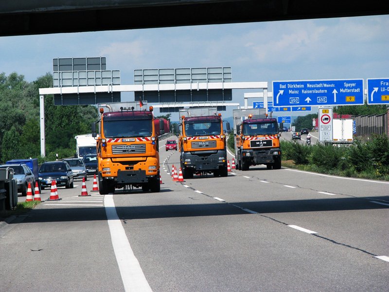 Absicherung bestehend aus dem Atego 1828 und einer fahrbaren Absperrtafel. (10.03.2009)