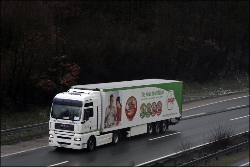 MAN TGA 18.410(?) aus Schleswig-Holstein ist mit einem Kühlauflieger für Popp-Feinkost "Die neue Salatküche" unterwges.