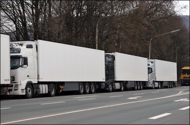 Silber-Schwarz-Weiß: Diese Drei russischen Volvo FH bzw. FH12 "GLOBETROTTER XL" 480PS Euro5 bzw. 460PS warten auf neue Fracht. (14.03.2009)