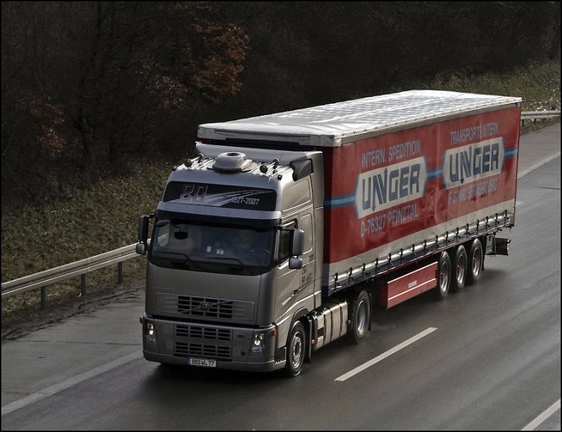 80 JAHRE VOLVO 1927-2007: VOLVO FH 480PS "80 JAHRE JUBILÄUMSEDITION" schleppt einen SCHWARZMÜLLER Planenauflieger der Spedition UNGER Internationale Spedition aus Pfinztal/Landkreis Karlsruhe. (24.03.2009)